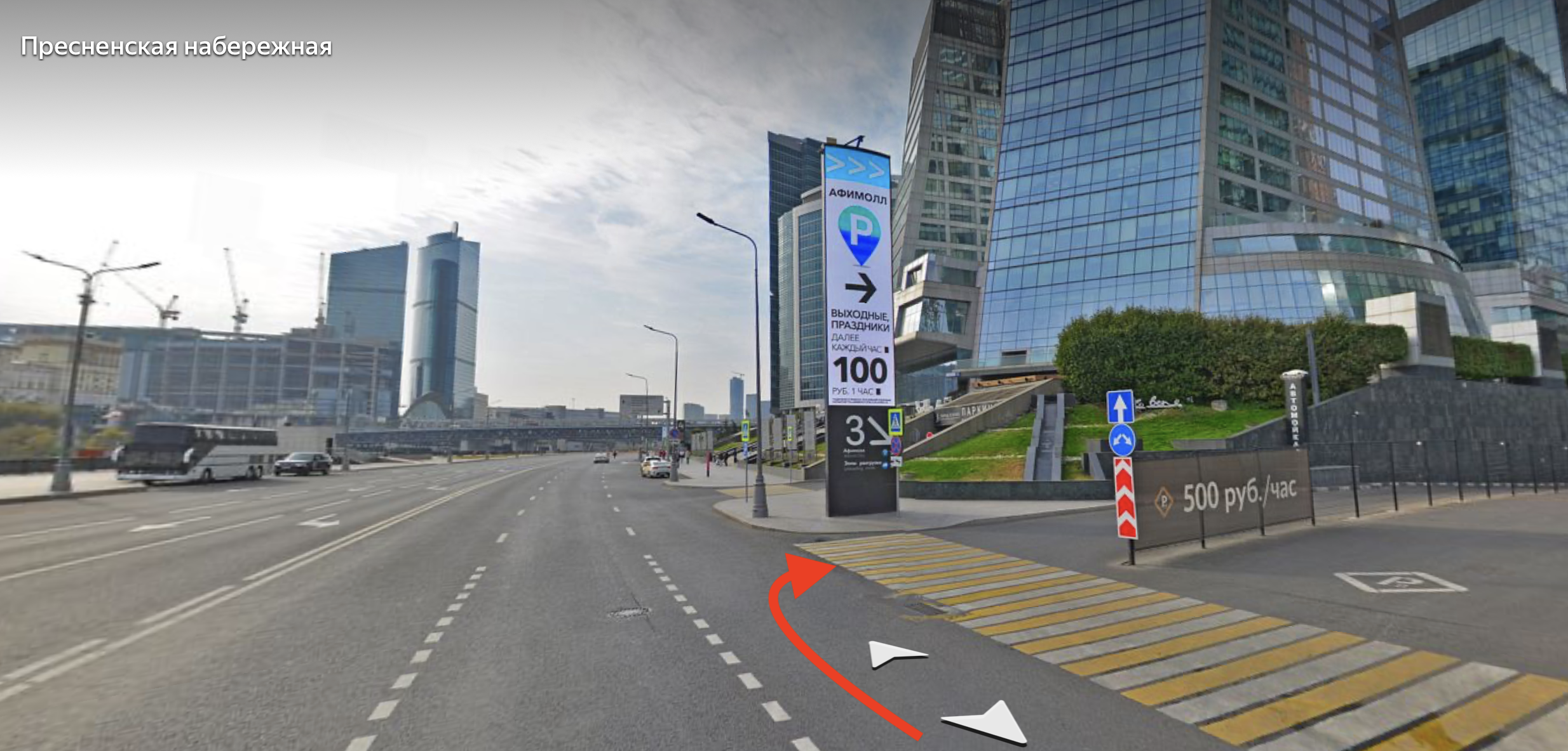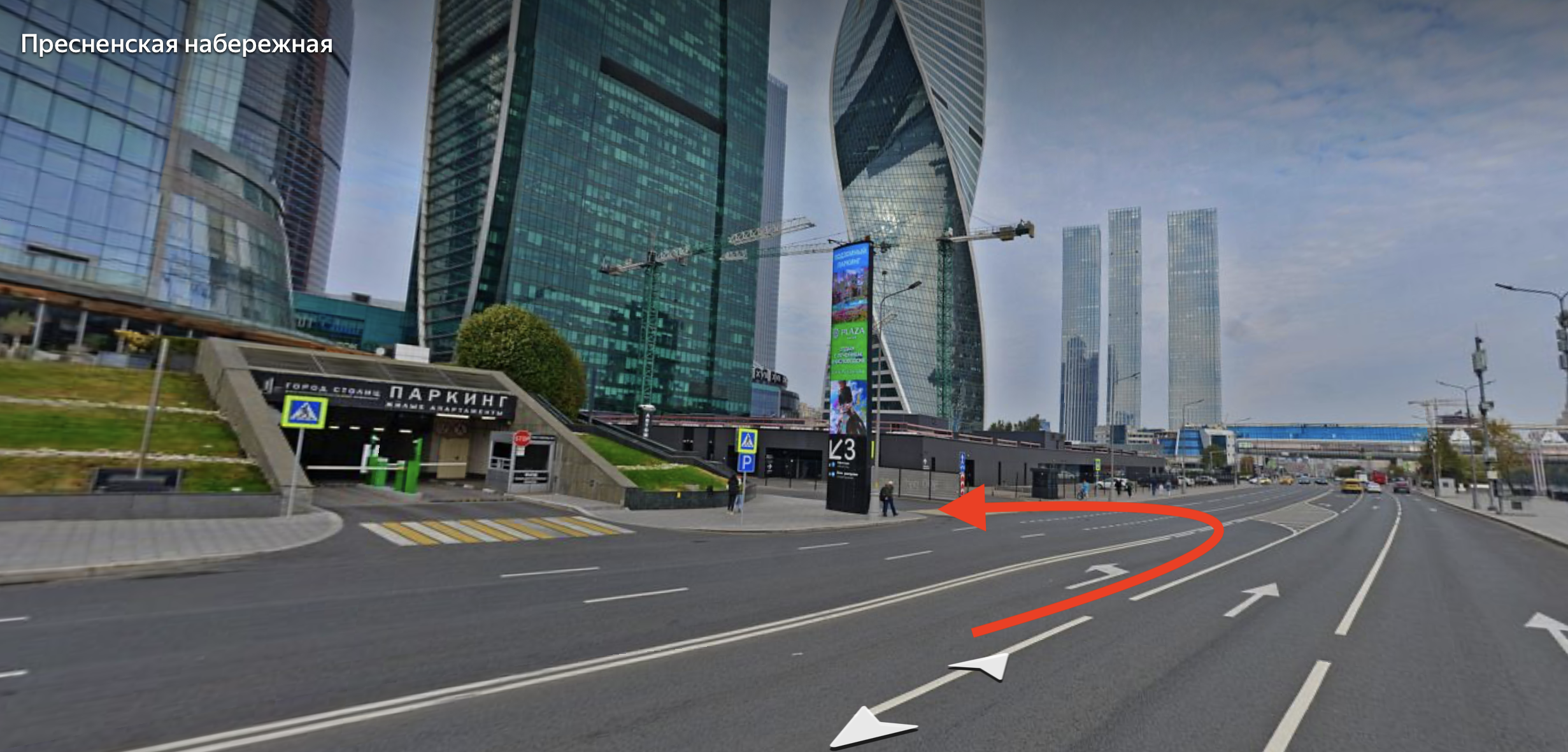 Если вы будете ехать со стороны ул. 1905 года, то просто двигайтесь вдоль комплекса зданий (справа) и ищите столб-указатель номер 3, набережная в этом случае будет слева по ходу движения. Перед столбом поверните направо и держитесь левее.